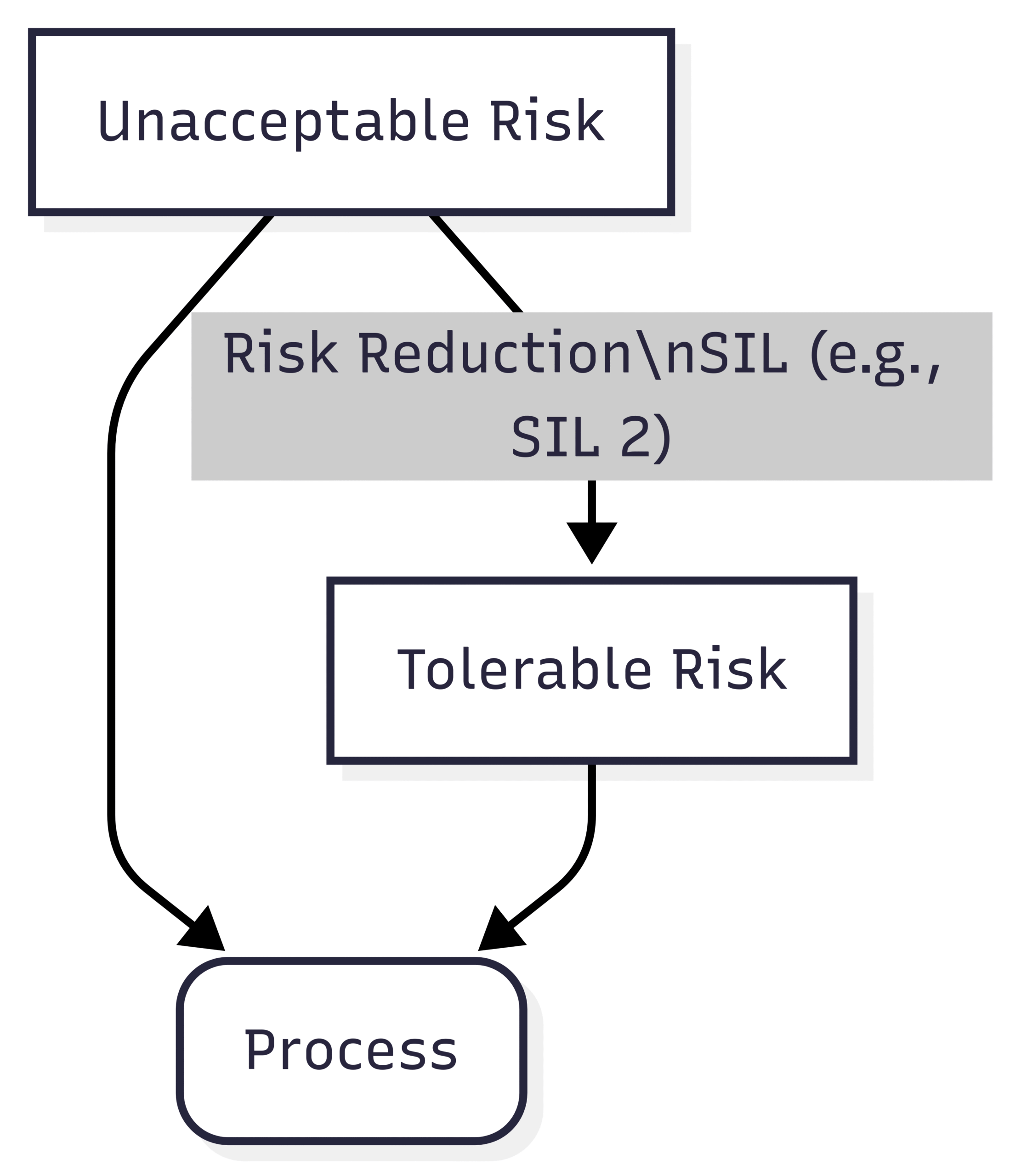 This conceptual diagram shows how a Safety Instrumented System (SIS) reduces the inherent risk of a process from an unacceptable level to a tolerable level. The amount of risk reduction required determines the necessary Safety Integrity Level (SIL).