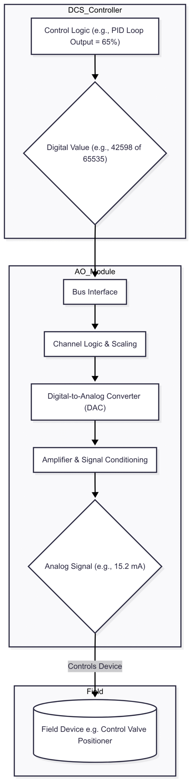 Imagine a chemical reactor where the temperature needs to be maintained at precisely $95^\\circ C$. The controller’s logic determines that a steam valve needs to be opened to 65% to achieve this. The controller sends a digital value representing “65%” to an analog output module. The module then converts this digital value into a corresponding analog signal (e.g., a 15.2 mA current) and sends it to the valve positioner, which physically opens the valve to the desired position.