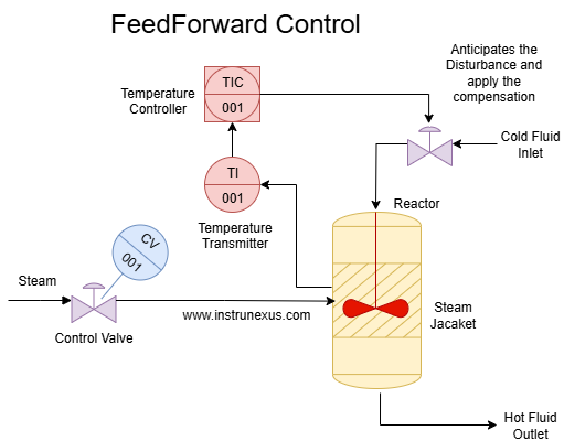 Calculate the Required Compensation: Based on a known model of the process, the feedforward controller calculates how much the heater input needs to change to counteract the effect of the incoming cold flow and maintain the desired reactor temperature.