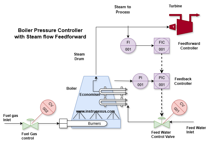 Feedforward Action: A sensor measures the steam flow rate leaving the boiler. If steam demand suddenly increases, the feedforward controller immediately increases the fuel flow to the burners and/or the airflow to the combustion chamber. This pre-emptive action ensures that more heat is generated to produce more steam, preventing a drop in boiler pressure before it significantly occurs.
