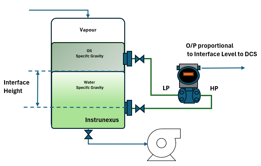 To comprehend this, let’s visualize a typical separator containing two immiscible liquids, for instance, oil and water. Water, being denser, will settle at the bottom, while the lighter oil will form a layer on top. A DP transmitter is installed with its high-pressure (HP) port connected to a lower nozzle on the vessel and its low-pressure (LP) port connected to a higher nozzle.