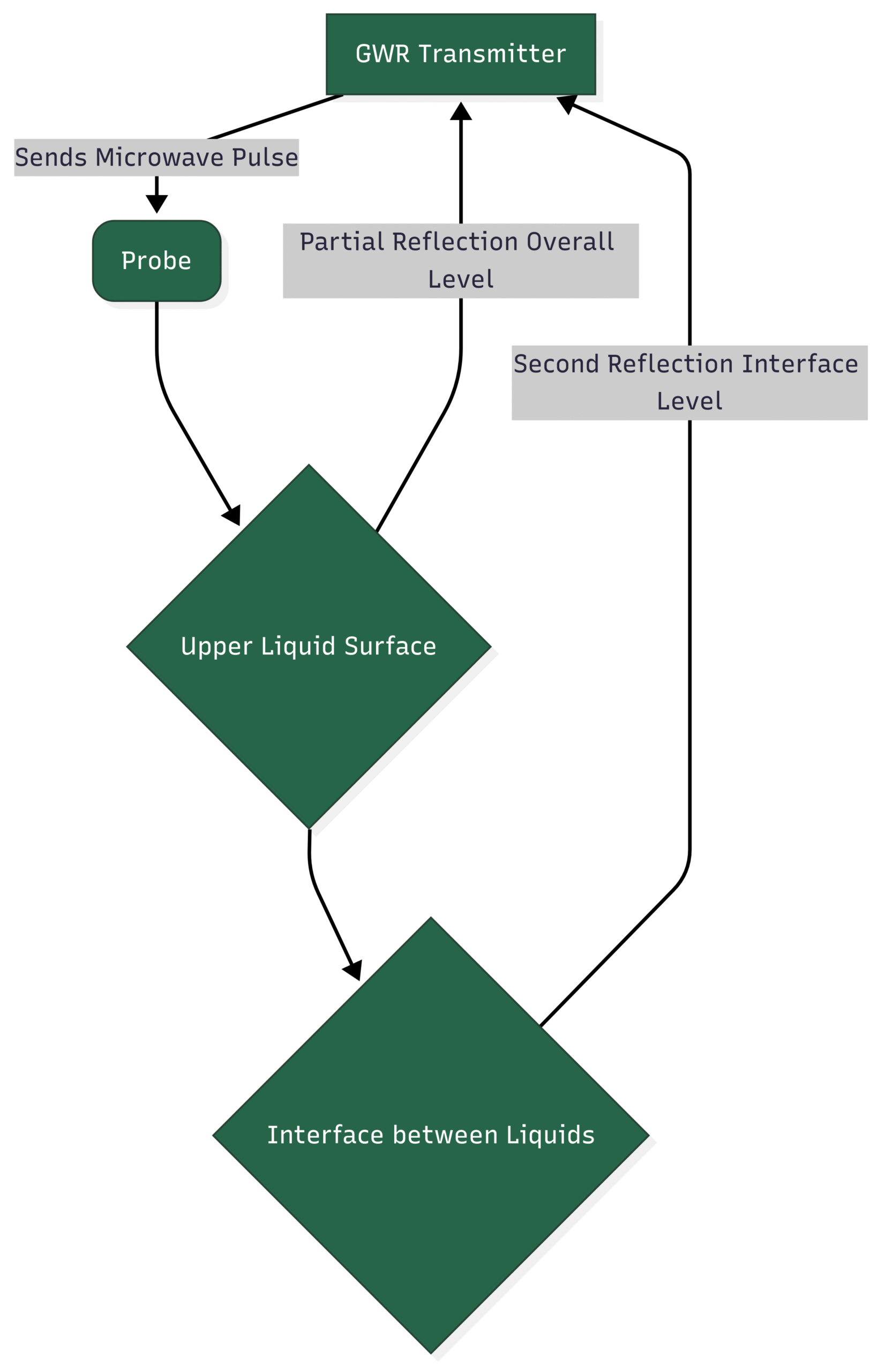 Guided Wave Radar (GWR) has emerged as one of the most reliable and versatile technologies for interface level measurement. It operates on the principle of time domain reflectometry (TDR).