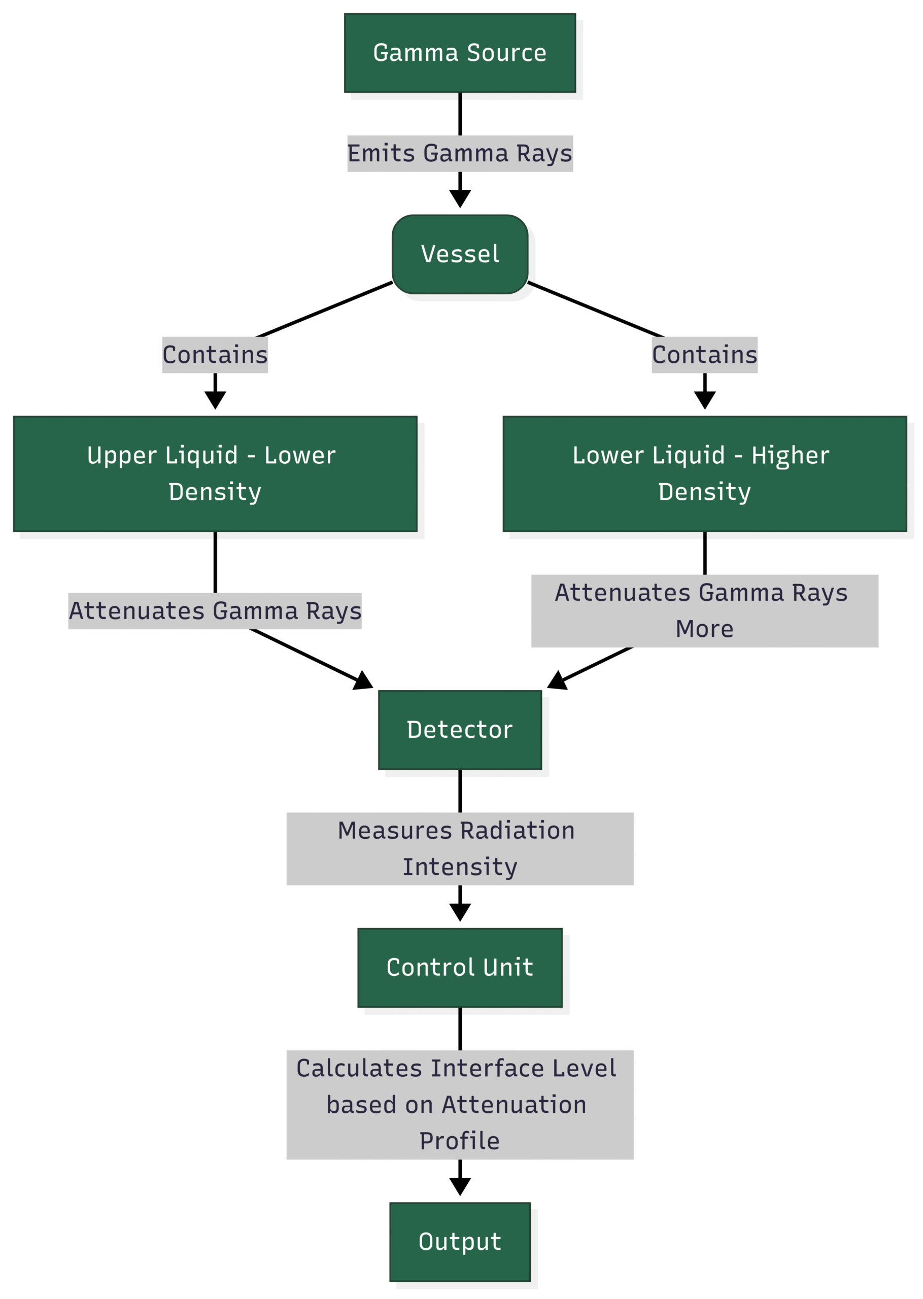 A low-intensity gamma radiation source is mounted on one side of the vessel, and a detector is mounted on the opposite side. The gamma rays pass through the vessel walls and the process liquids. As the radiation travels through the different liquid layers, it is attenuated (weakened) to varying degrees depending on the density of each liquid.
